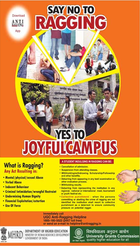 • Collective punishment : When the persons committing or abetting the crime of ragging are not identified, the institution shall resort to collective punishment.
